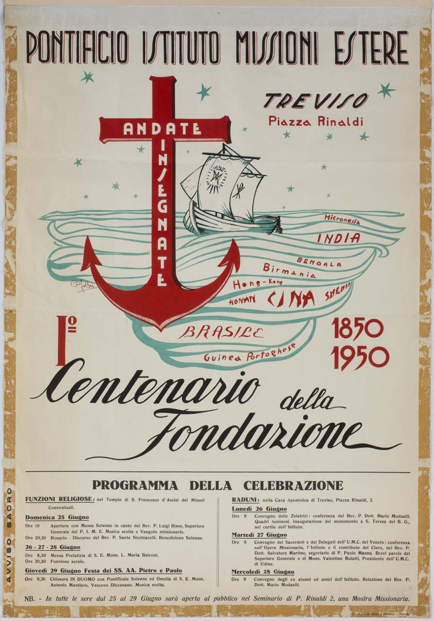 Lettura iconografica: ancora; barca a vela; simboli cristiani; mare. Categoria merceologica/ tipo evento: religione cattolica; organizzazioni religiose; anifestazioni; celebrazioni; centenario di fondazione; inaugurazioni; celebrazione della Messa; convegni; mostre. Nomi: PIME; Pontificio Istituto Missioni Estere; I Centenario della Fondazione; Luigi Risso; Sante Nicchiarelli; Lorenzo Maria Balconi; Antonio Mantiero; Festa dei Santi Apostoli Pietro e Paolo; Convegno delle Zelatrici; Mario Modaelli; Inaugurazione del Monumento a Santa Teresa del Bambin Gesù; Convegno dei sacerdoti e dei delegati della Unione Missionaria del Clero del Veneto; Salvatore Martino; Paolo Manna; Valentino Buiatti; UMC; Unione Missionaria del Clero; Convegno degli ex alunni ed amici dell’Istituto; Mostra Missionaria; Tempio di San Francesco d'Assisi; Duomo; Casa Apostolica; Seminario. Luoghi: Treviso; Udine; Micronesia; India; Bengala; Birmania; Cina; Honan; Henan; Shensi; Shaanxi; Hong-Kong; Brasile; Guinea Portoghese; Guinea Bissau