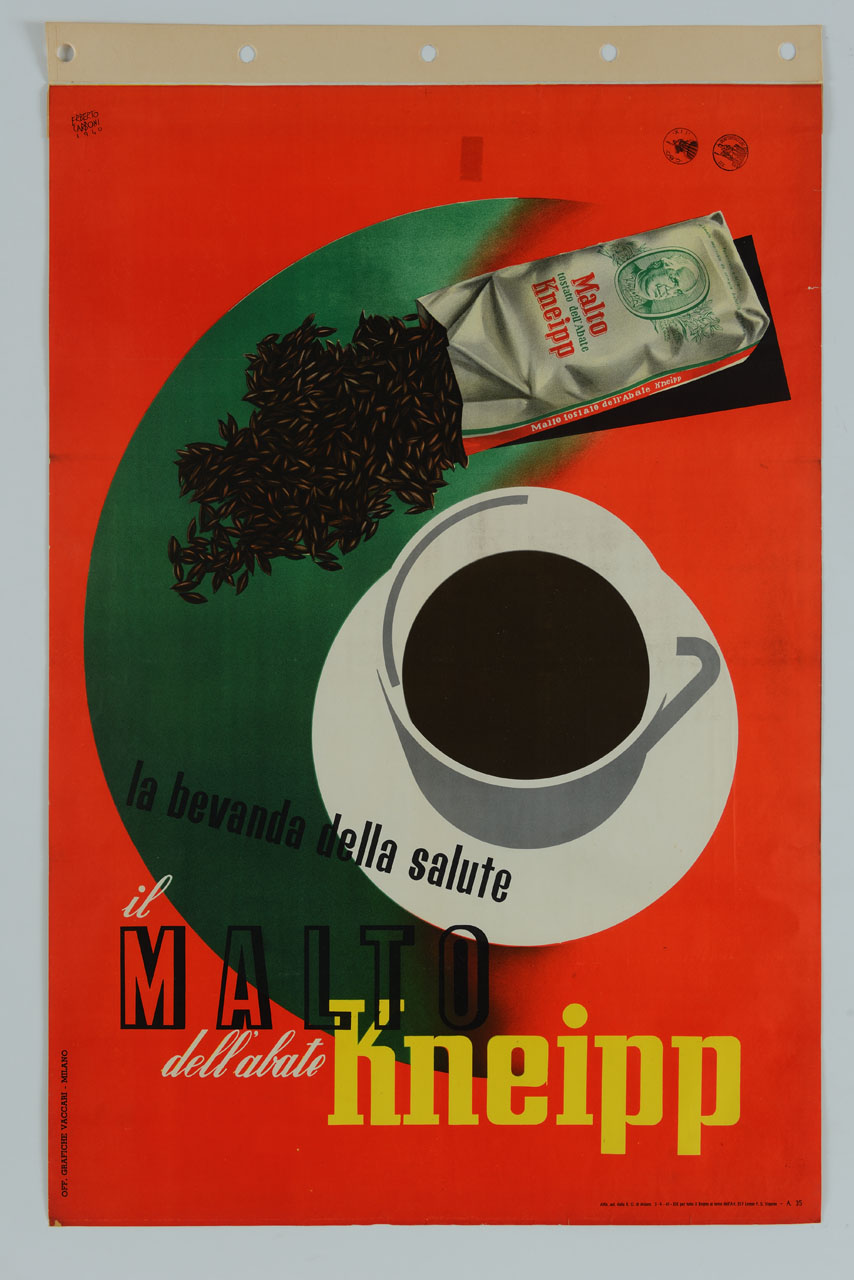 Lettura iconografica: chicchi tostati di malto; pacco di caffè di malto; ritratto; tazzina di caffè. Categoria merceologica/ tipo evento: industria alimentare; succedanei del caffè; caffè di malto. Nomi: malto dell’abate Kneipp; Pfarrer Kneipps Gesundheitskaffee; Sbastian Kneipp. Luoghi: Milano