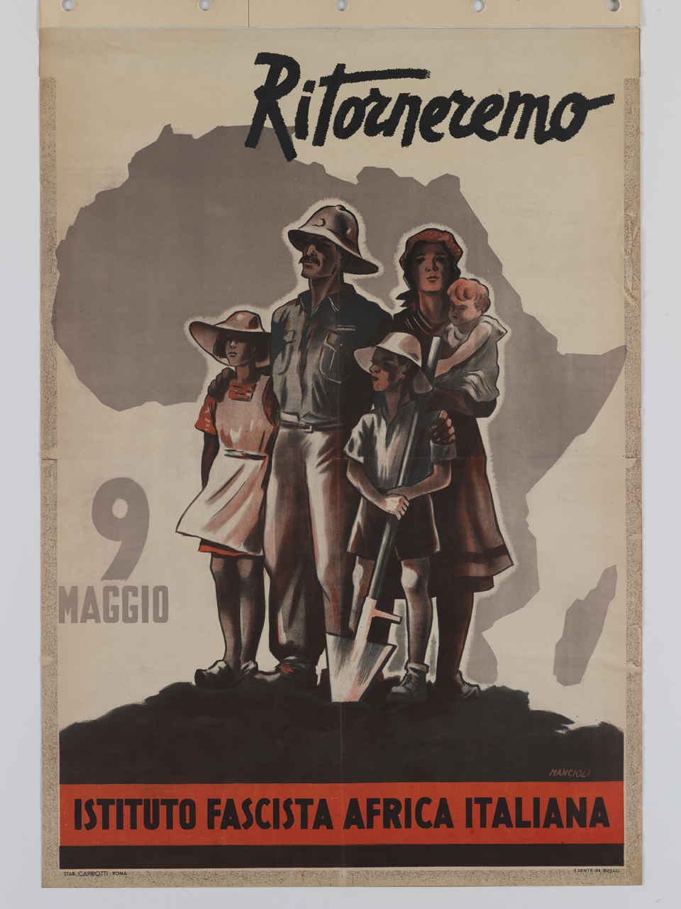 Lettura iconografica: figure maschili; figure femminili; famiglia; coloni; vanga; cartina dell’Africa. Categoria merceologica/ tipo evento: informazione e comunicazione; propaganda fascista; ricorrenze; istituzioni. Nomi: Istituto Fascista Africa Italiana