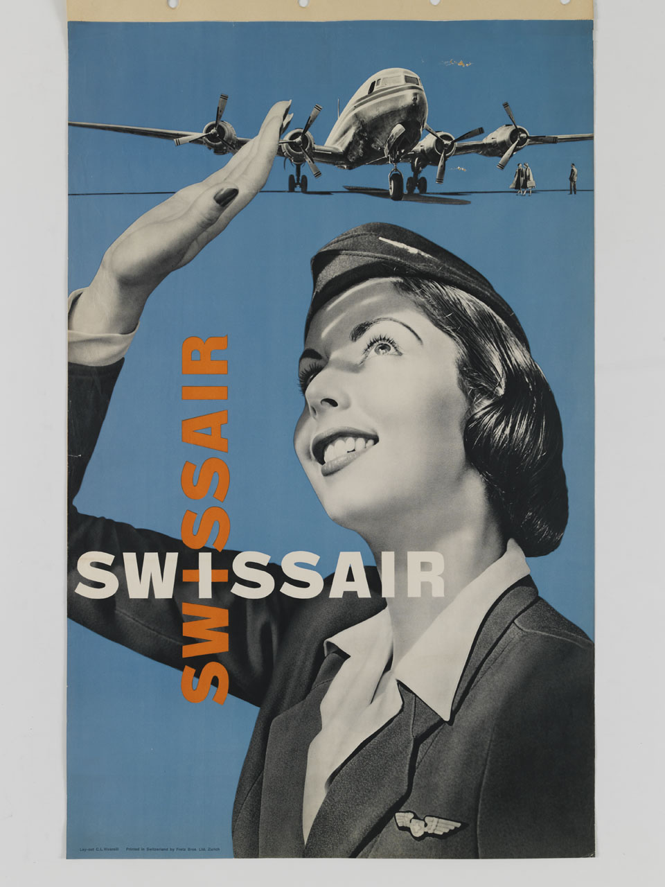 Lettura iconografica: figura femminile; divisa; hostess; aereo; figure femminili; figura maschile. Categoria merceologica/ tipo evento: trasporti; trasporto aereo; compagnia aerea. Nomi: Swissair