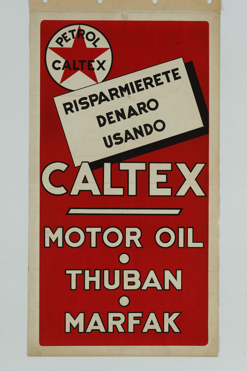 Lettura iconografica: stemma con croce rossa su fondo bianco. Categoria merceologica/ tipo evento: industria petrolifera; derivati del petrolio; olio lubrificante. Nomi: Petro Caltex; Thuban; Marfak. Luoghi: U.S.A.; Stati Uniti; California