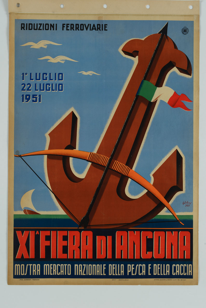 Lettura iconografica: ancora; arco; freccia; bandiera tricolore; mare; barca a vela; gabbiani. Categoria merceologica/ tipo evento: pesca; caccia; mostre mercato; enti di promozione turistica; riduzioni ferroviarie. Nomi: XI Fiera di Ancona; Mostra Mercato Nazionale della Pesca e della Caccia; ENIT; Ente Nazionale per l'incremento delle Industrie Turistiche; Ferrovie dello Stato. Luoghi: Ancona