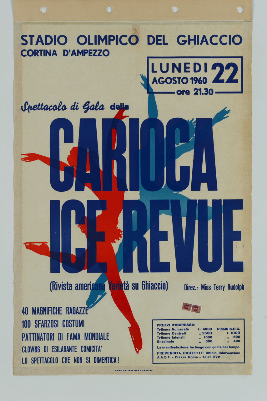 Lettura iconografica: figure femminili; pattini. Categoria merceologica/ tipo evento: sport; pattinaggio su ghiaccio; rassegne; impianti sportivi; stadio olimpico del ghiaccio. Nomi: Stadio Olimpico del Ghiaccio; Carioca Ice Revue; Miss Terry Rudolph. Luoghi: Belluno; Cotrina d'Ampezzo