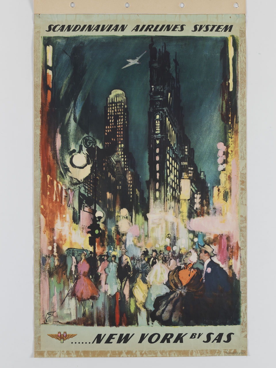 Lettura iconografica: figure maschili; figure femminili; veduta di città; architetture; aeroplano. Categoria merceologica/ tipo evento: trasporti; trasporto aereo; compagnia aerea. Nomi: SAS; Scandinavian Airlines System. Luoghi: New York