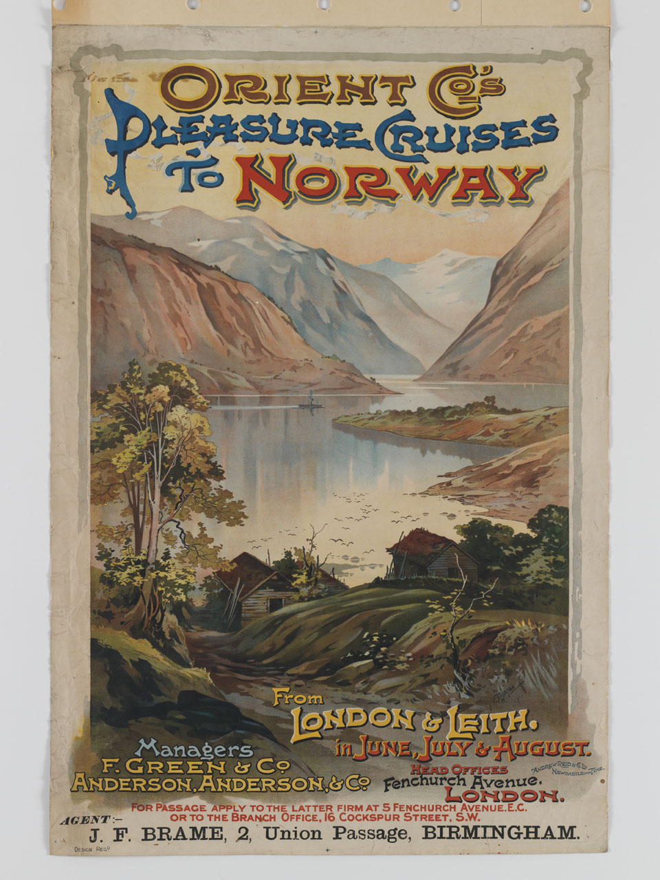Lettura iconografica: mare; montagne; fiordo. Categoria merceologica/ tipo evento: trasporti; trasporto marittimo; compagnia di navigazione; turismo; crociere; agenzie di viaggio. Nomi: Orient Company Line; F. Green; Anderson; J.F. Brame. Luoghi: Norway; Norvegia; Regno Unito; Inghilterra; London; Londra; Leigh; Birmingham