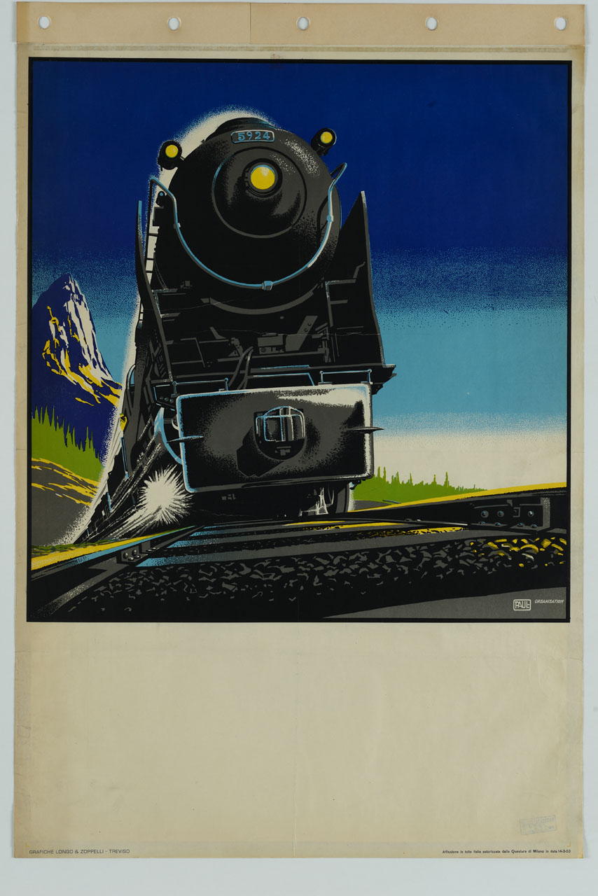 Lettura iconografica: treno; binario; montagna; alberi. Categoria merceologica/ tipo evento:trasporti; trasporto terrestre; treno. Luoghi: Padova, Bassano del Grappa