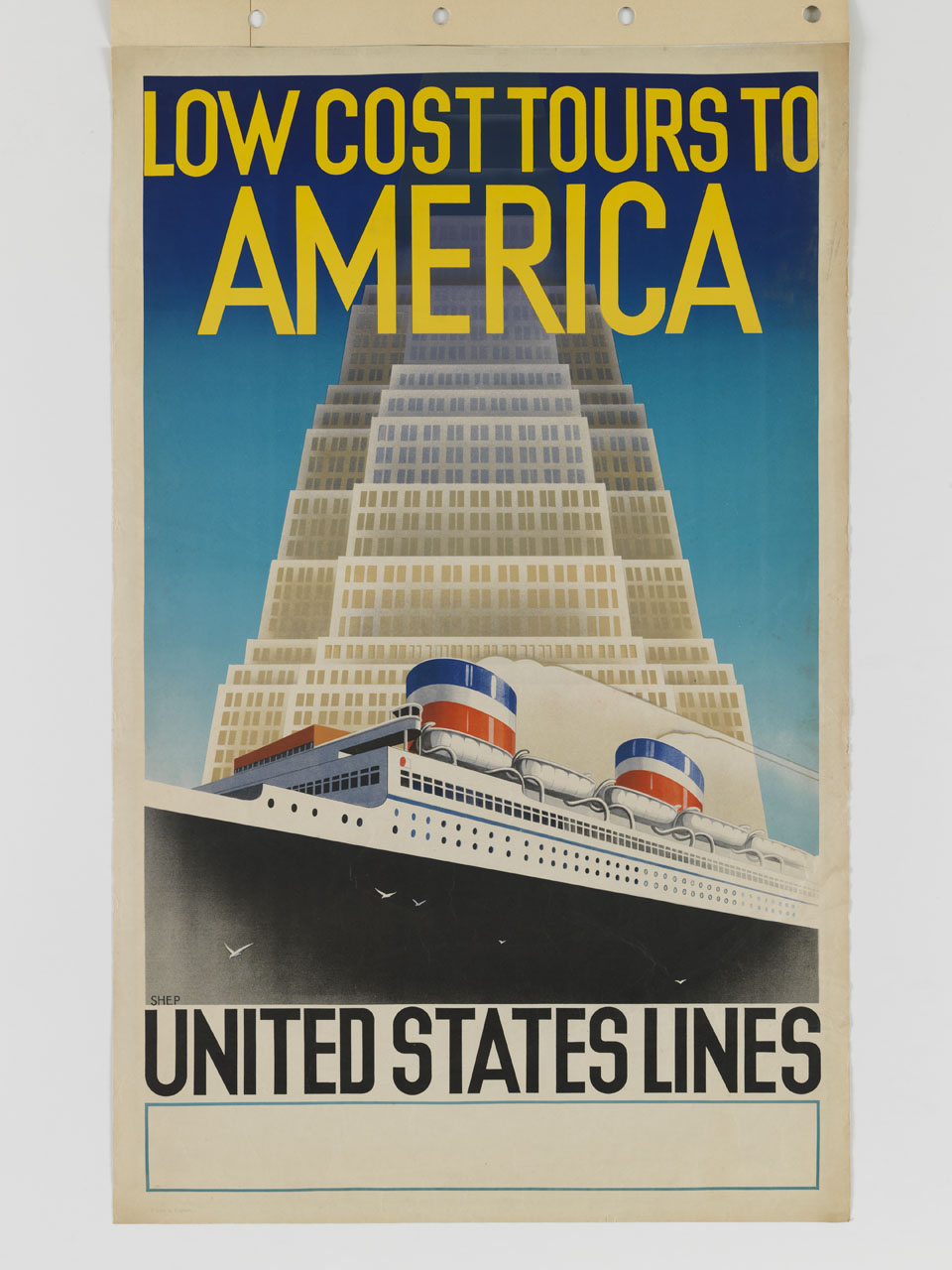 Lettura iconografica: grattacielo; nave. Categoria merceologica/ tipo evento: trasporti; trasporto marittimo; compagnia di navigazione; servizio di navigazione; piroscafo; transatlantico; turismo; crociere. Nomi: America; United States Lines. Luoghi: Stati Uniti d'America