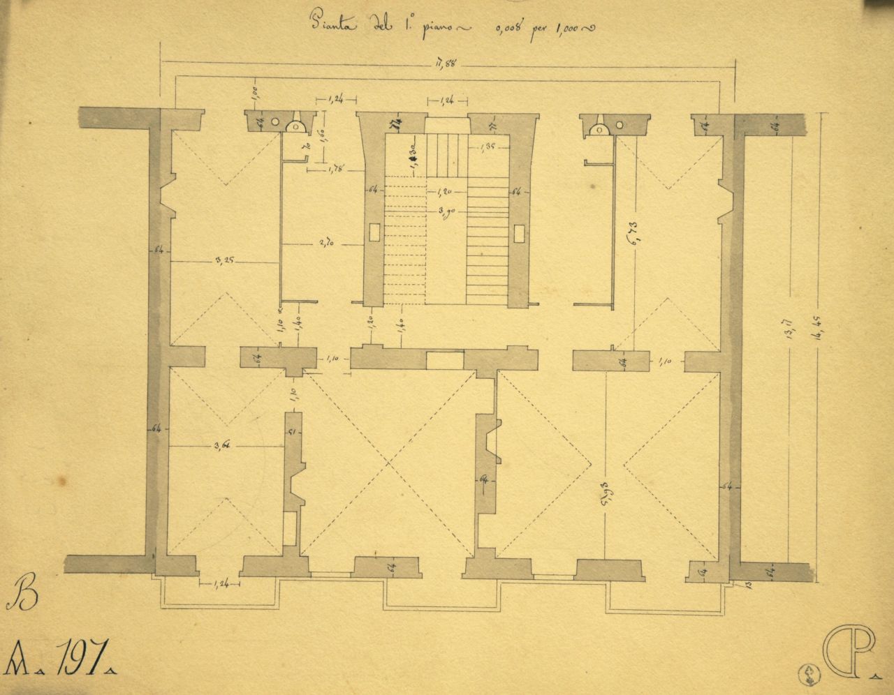 Pianta quotata del primo piano di edificio a quattro piani, Pianta del 1° piano