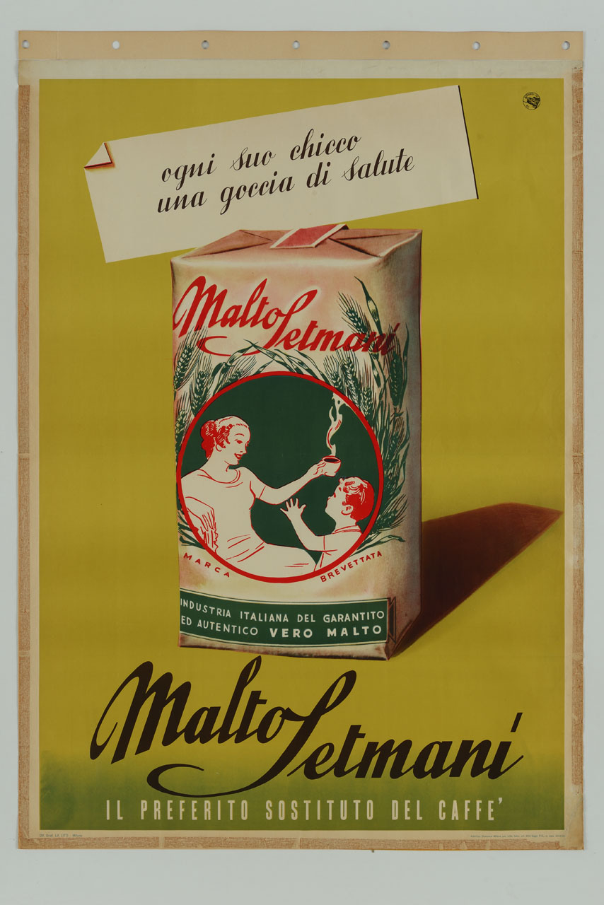 Lettura iconografica: confezione di carta; scatola di malto in polvere; figura femminile; bambino; tazzina fumante; spighe di orzo. Categoria merceologica/ tipo evento: industria alimentare; succedanei del caffè. Nomi: malto Setmani; cariosside; malto. Luoghi: Italia; Milano