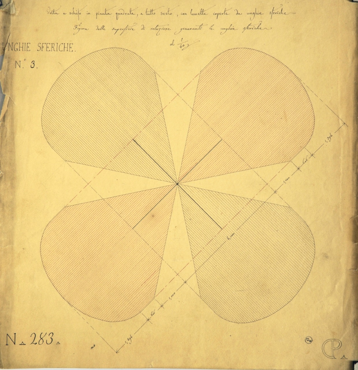 Unghie sferiche N°.3, Studio di geometria: pianta quotata di lunette coperte da unghie sferiche di volta a padiglione su pianta composita (disegno architettonico)