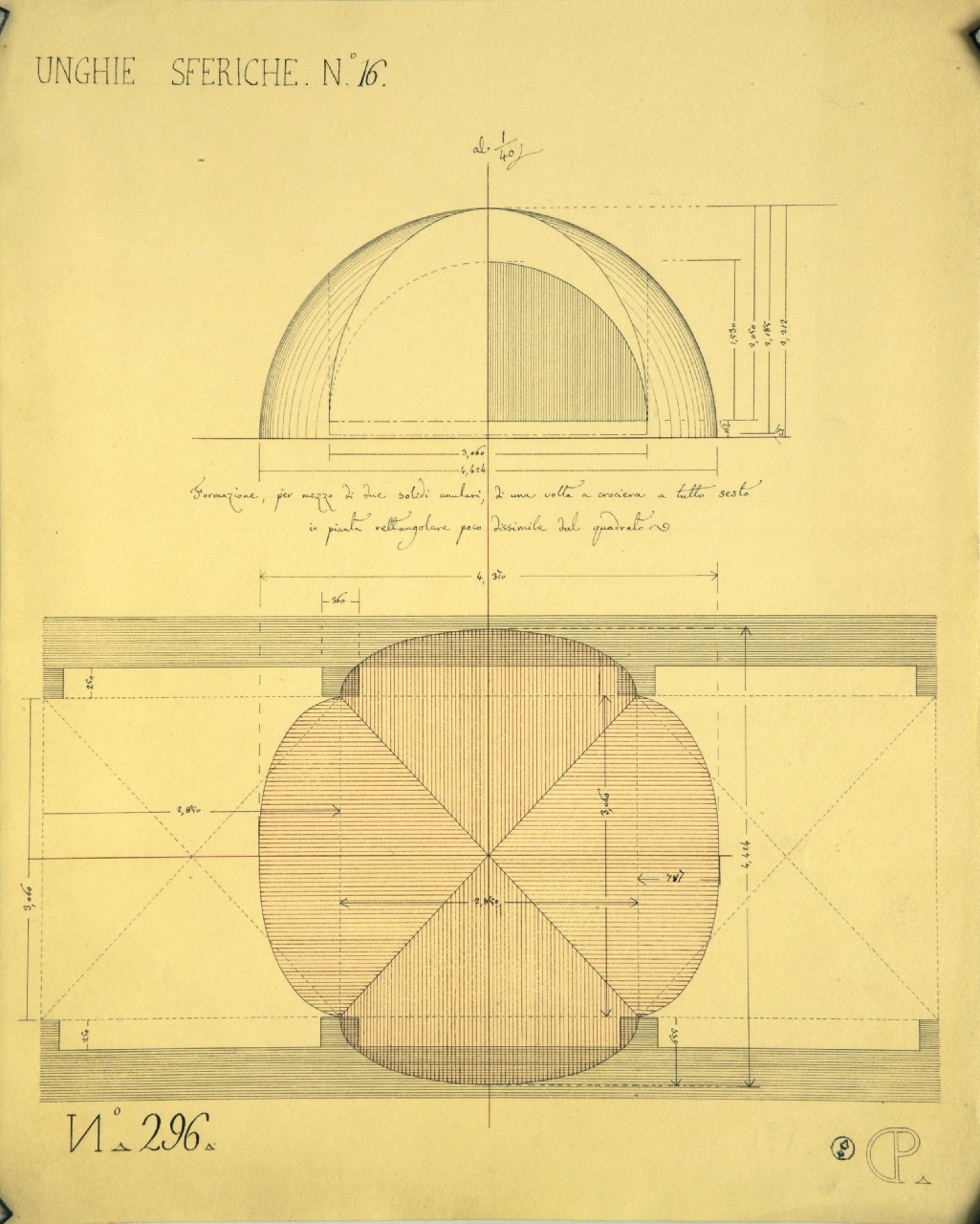 Studio di geometria: sezione longitudinale e pianta quotate di volta a crociera su pianta rettangolare, Unghie sferiche N°. 16