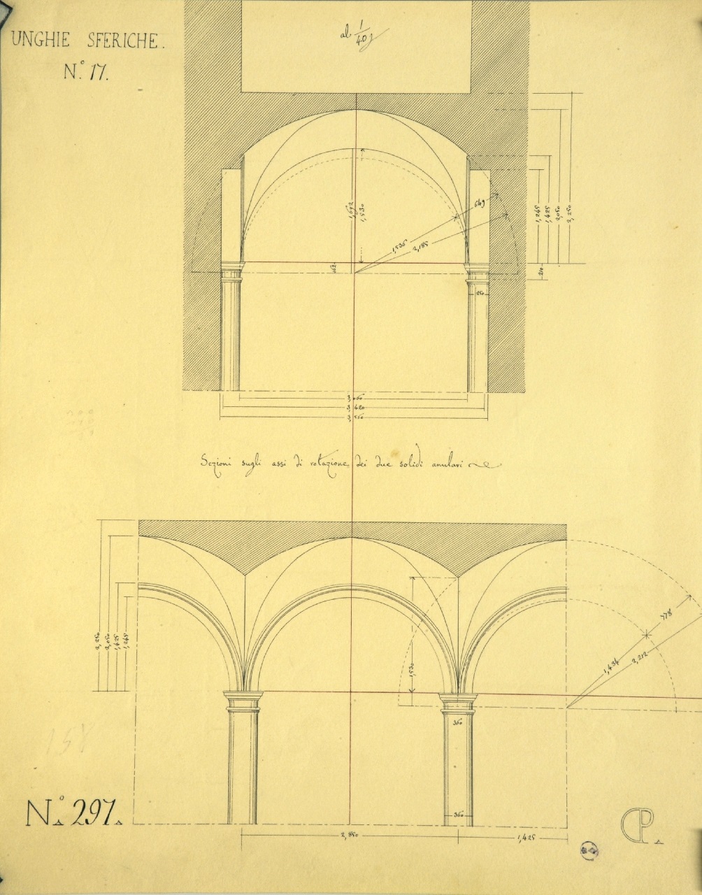 Studio di geometria: sezione longitudinale e trasversale quotate di volta a crociera su base rettangolare, Unghie sferiche N°. 17