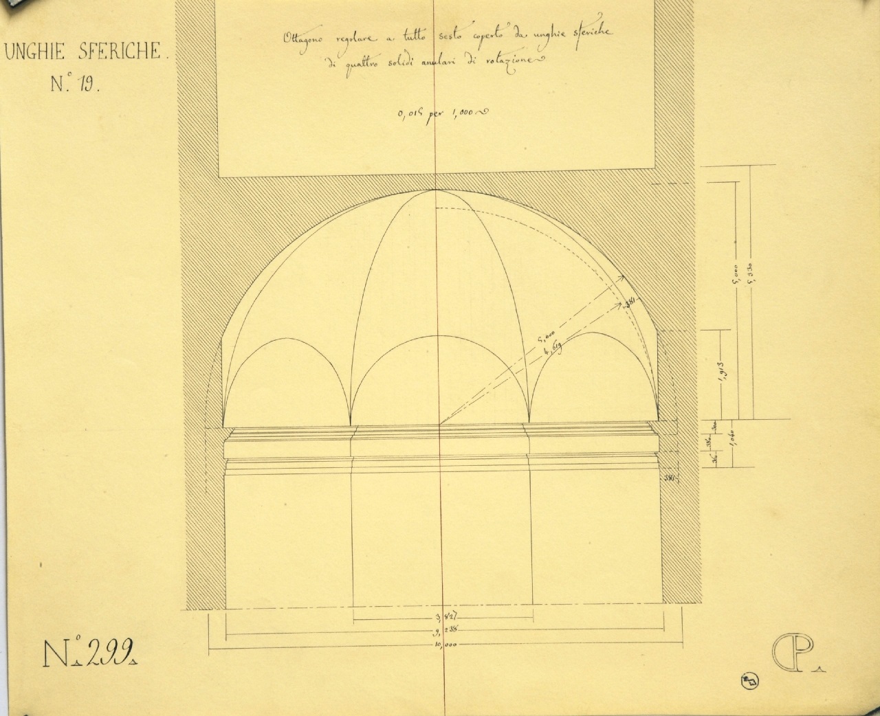 Studio di geometria: sezione trasversale quotata di volta a tutto sesto su pianta ottagonale con unghie sferiche, Unghie sferiche N°. 19
