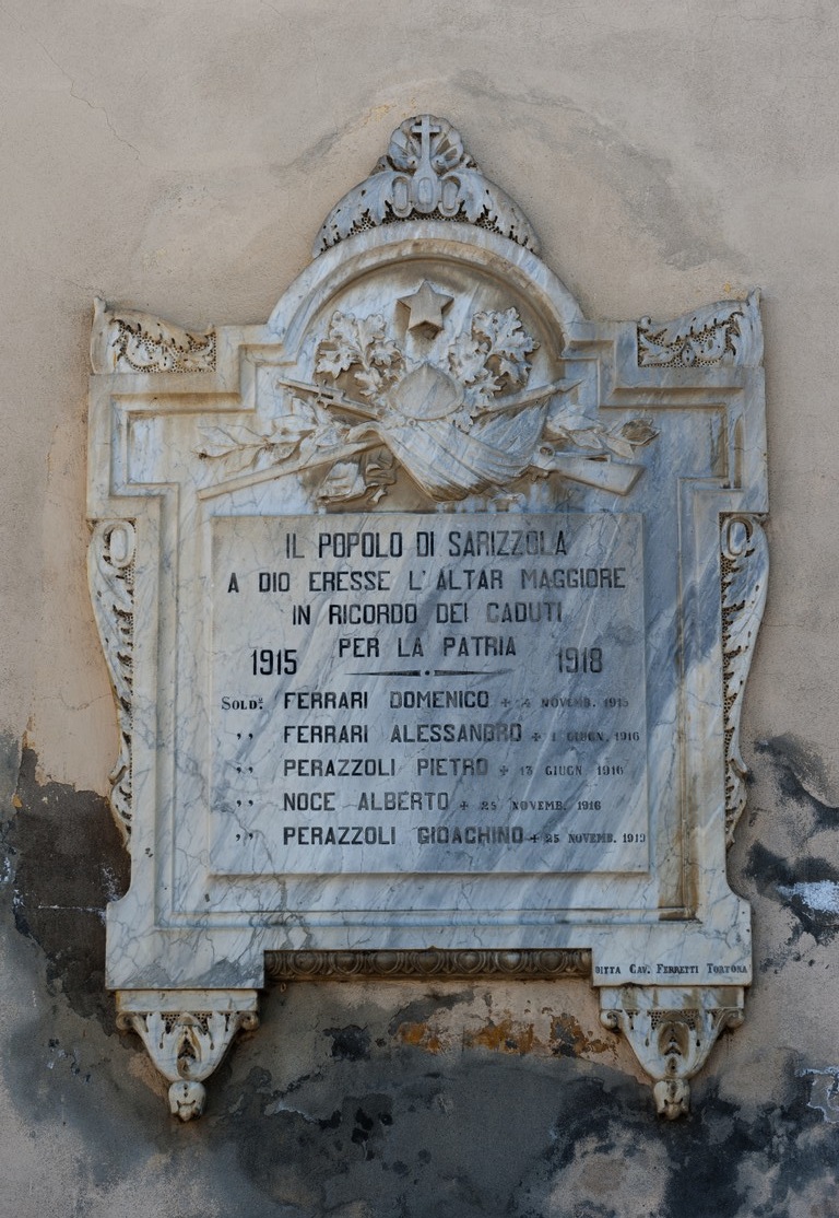 Lapide commemorativa con elenco di nomi di caduti della prima guerra mondiale, ornata da bassorilievi a foglie d'acanto e coronata da trapaion di armi e fronde di alloro e quercia.. Armi: baionetta. Oggetti: elmo; tricolore. Piante: rami di quercia; rami di alloro