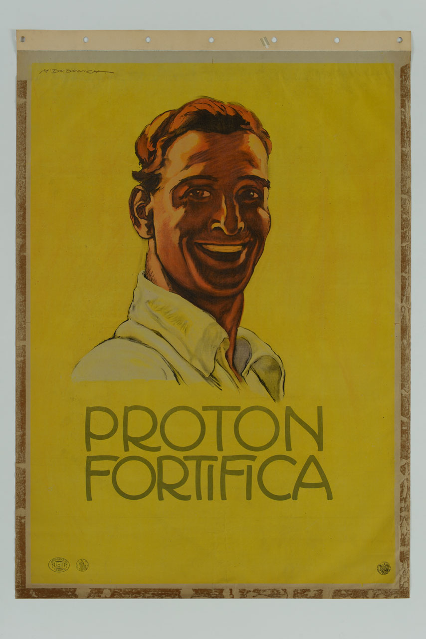 Lettura iconografica: figura maschile; viso; sorriso; ritratto. Categoria merceologica/ tipo evento: industria farmaceutica; medicinali; ricostituente. Nomi: Proton. Luoghi: Torino; Pirerolo