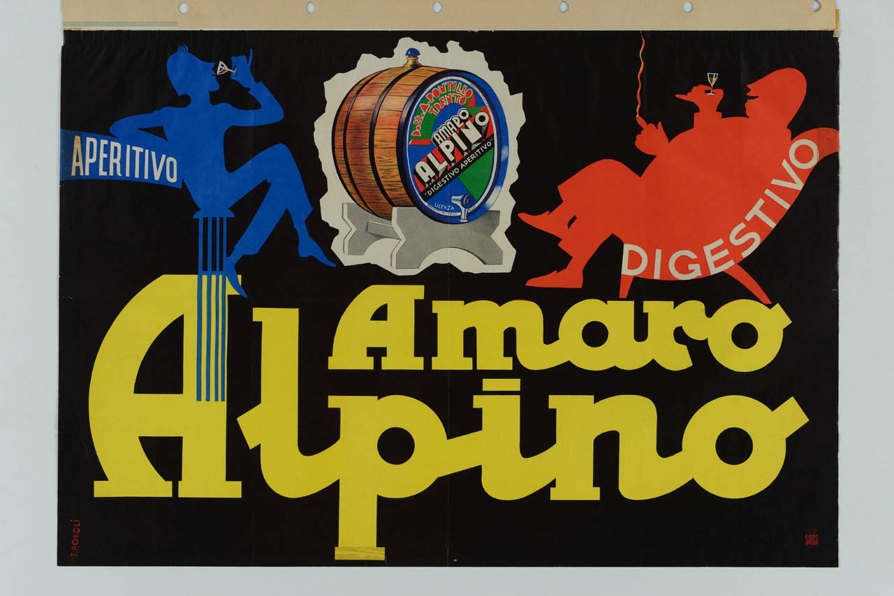 Lettura iconografica: figure maschili; sgabello; poltrona; sigaro; bicchiere; botte; piedistallo. Categoria merceologica/ tipo evento: industria alimentare; bevande; liquori; amaro. Nomi: Amaro Alpino; A. Pontillo. Luoghi: Trento