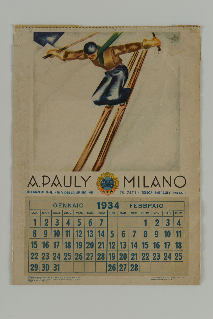Lettura iconografica: figura femminile; sci; racchette; cappello; sciarpa; neve. Categoria merceologica/ tipo evento: commercio; negozio di abbigliamento; articoli sportivi. Nomi: APM; Augusto Pauly Milano. Luoghi: Milano