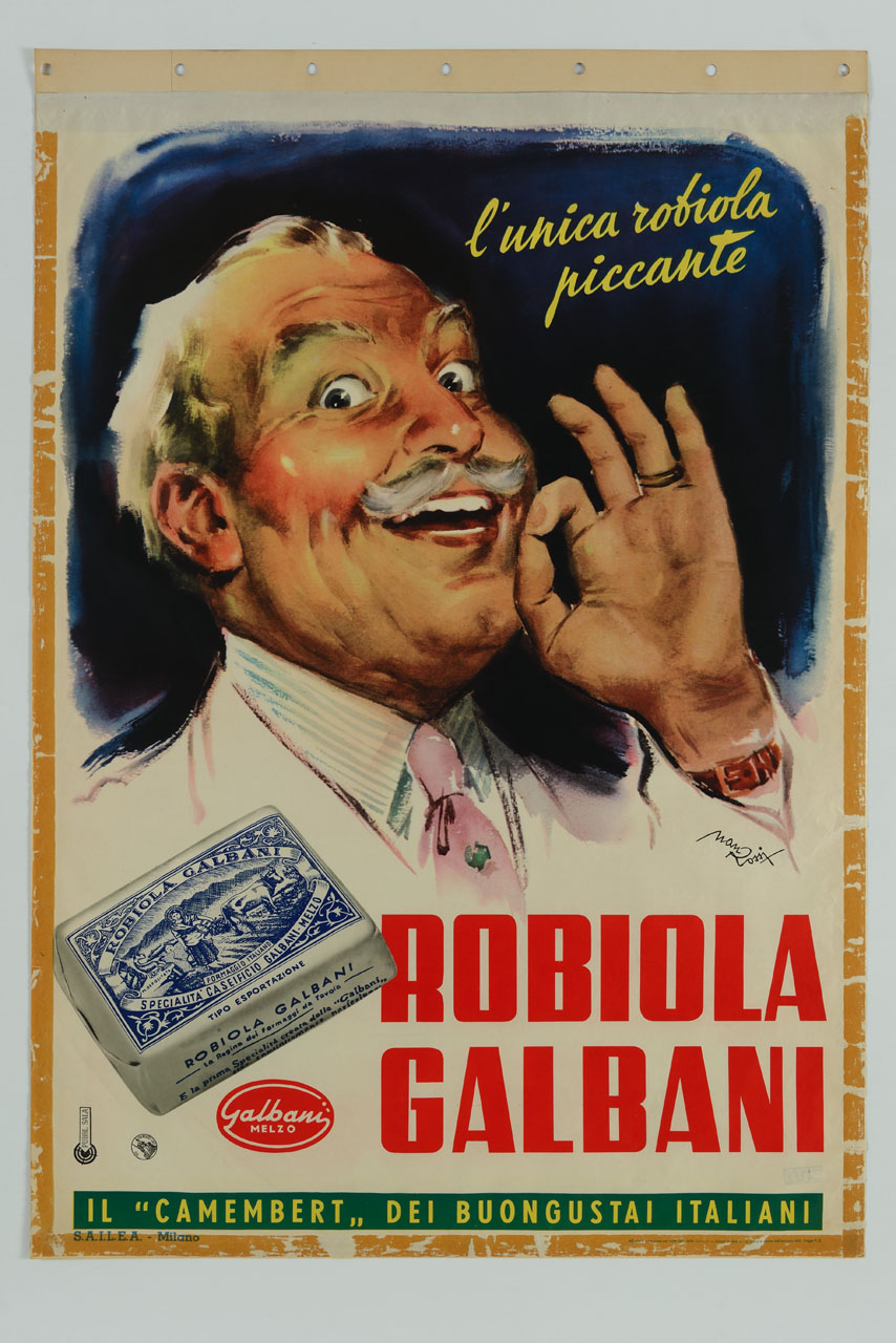 Lettura iconografica: figura maschile; viso; confezione di formaggio. Categoria merceologica/ tipo evento: industria alimentare; prodotti lattiero caseari; derivati del latte; formaggio. Nomi: Robiola Galbani; Caseificio Galbani. Luoghi: Milano; Melzo