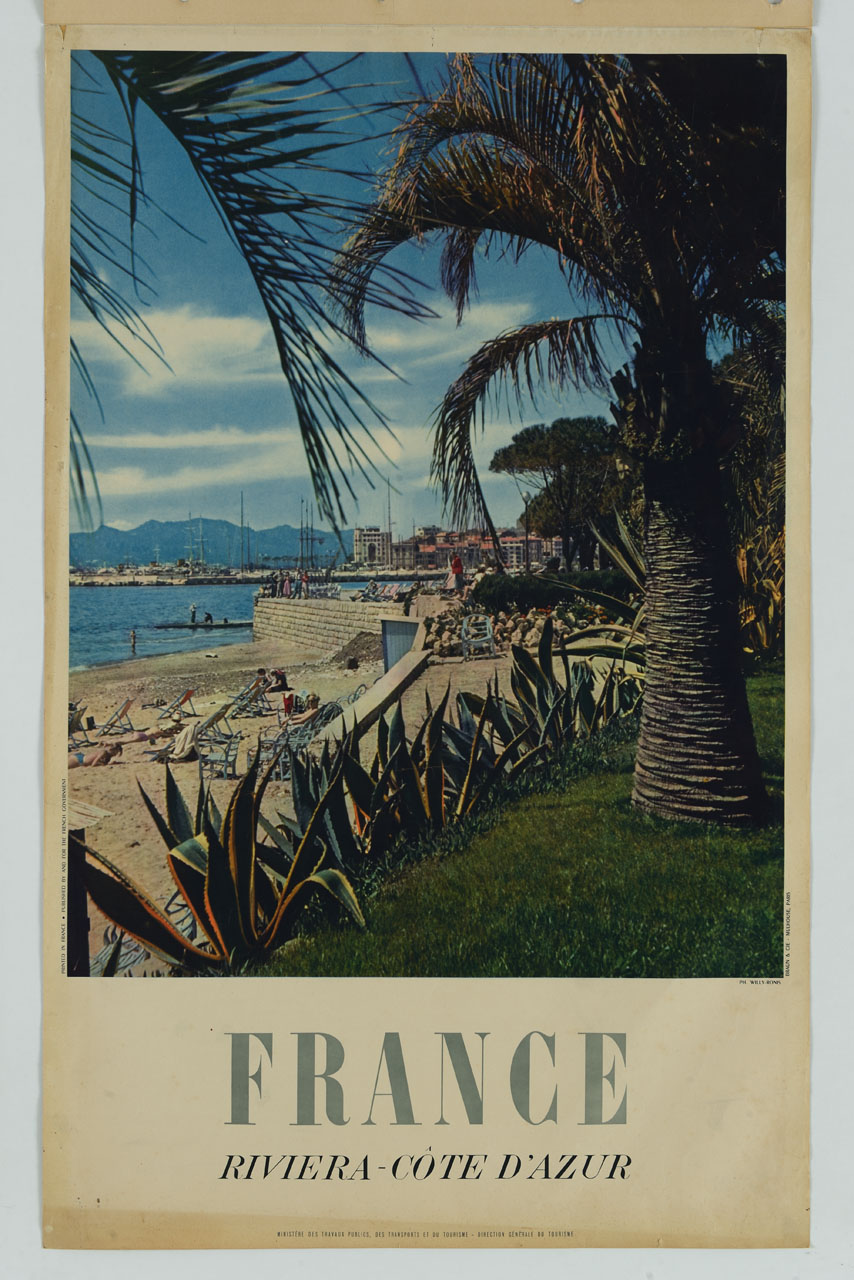 Lettura iconografica: paesaggio costiero; spiaggia; stabilimento balneare; palma; piante grasse. Categoria merceologica/ tipo evento: turismo; amministrazione pubblica; amministrazione centrale; enti di promozione turistica. Nomi: France; Riviera Côte d'Azur; Ministère des Travaux Publics des Transports et du Tourisme; Direction Générale du Tourisme. Luoghi: Francia; Costa Azzurra