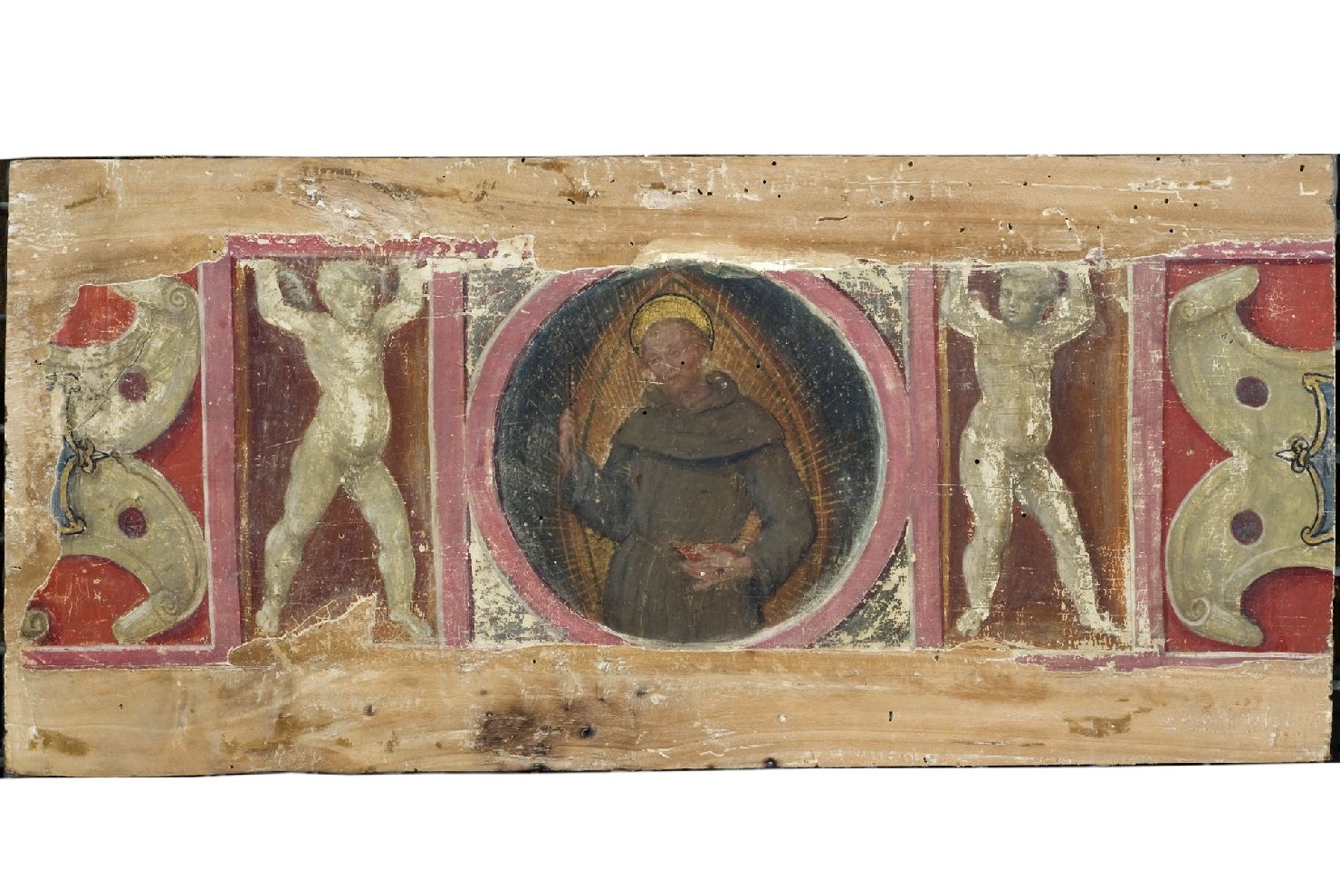 Si tratta di una delle tre tavolette, che forse costituivano la predella di una tavola maggiore. E' probabile che manchino alcuni elementi di tale predella.. Personaggi: San Francesco. Figure: putti telamoni