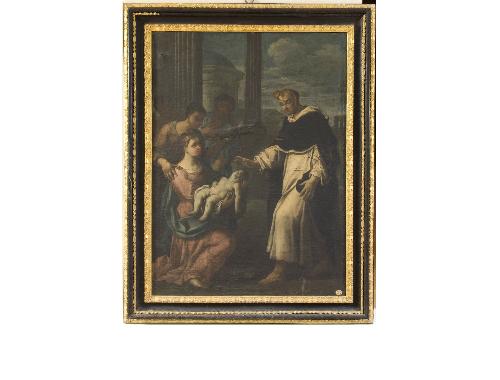 Tela rettangolare con cornice.. Soggetti sacri: miracolo di un santo domenicano. Personaggi: santo domenicano. Figure: donne; bambino. Architetture