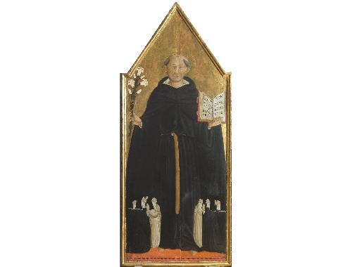 Tavola cuspidata.. Personaggi: San Nicola da Tolentino. Figure: monache domenicane