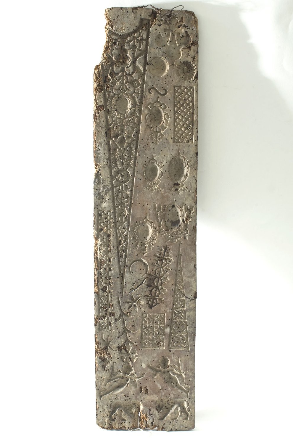Stampo in legno intagliato con diversi motivi di tipo decorativo.. Architetture fantastiche. Figure. Vegetali. Corpi celesti. Araldica. Decorazioni