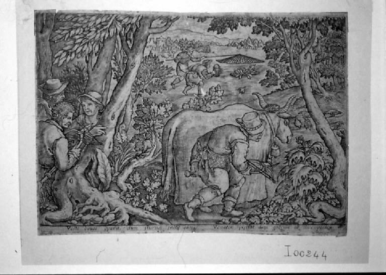 FIGURE: FIGURE MASCHILI. ABBIGLIAMENTO; CAPPELLO; STIVALI; GIUBBA; FARSETTO; PANTALONI; SACCA; BORSA; FRECCE. OGGETTI: RETE; TRAVESTIMENTO; CAMPANA; RICHIAMO. PAESAGGIO. PIANTE. ARMI: ALABARDA