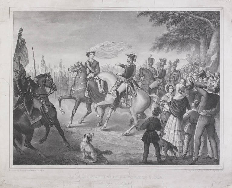 Figure: uomini; donne; soldati; bambini. Animali: cani; cavalli. Armi: spade; fucili. Abbigliamento: divise militari. Vegetali: alberi