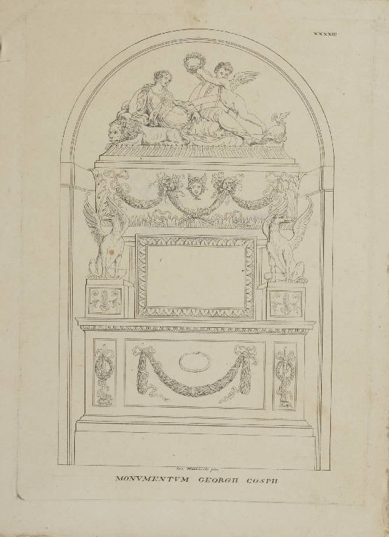 Allegoria: Virtù. Figure: genio alato. Sculture: monumento funebre; statua. Attributi: (Virtù) elmo, scudo, leone; (genio alato): corona. Mobilia: letto. Costruzioni: torri. Decorazioni: nastri; cornucopie; festoni; testa alata. Animali: serpente