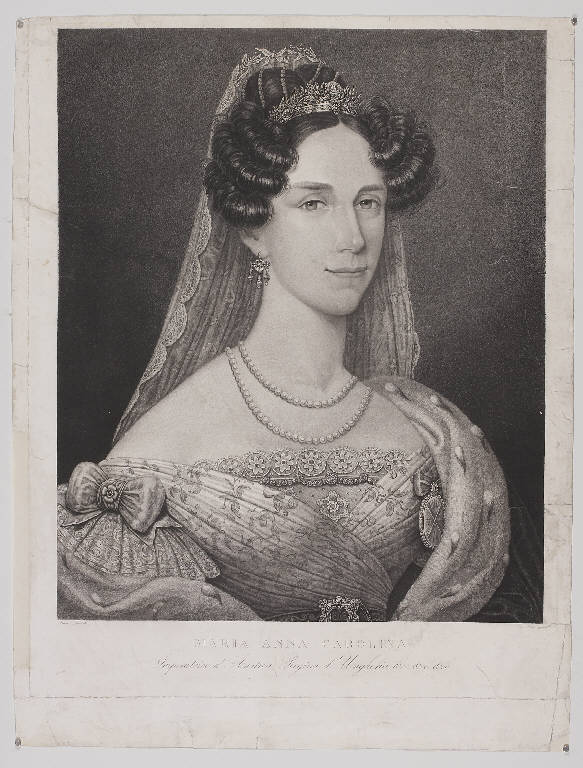 Ritratti: busto. Figure: donna. Personaggi: Maria Anna Carolina di Savoia. Abbigliamento: abito; velo; collana; diadema; cintura; fiocco; medaglia; acconciatura