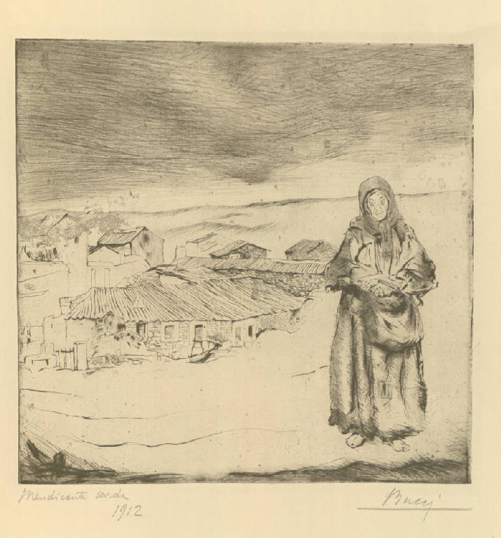 Figure non identificabili. Paesaggio. Costruzioni: case