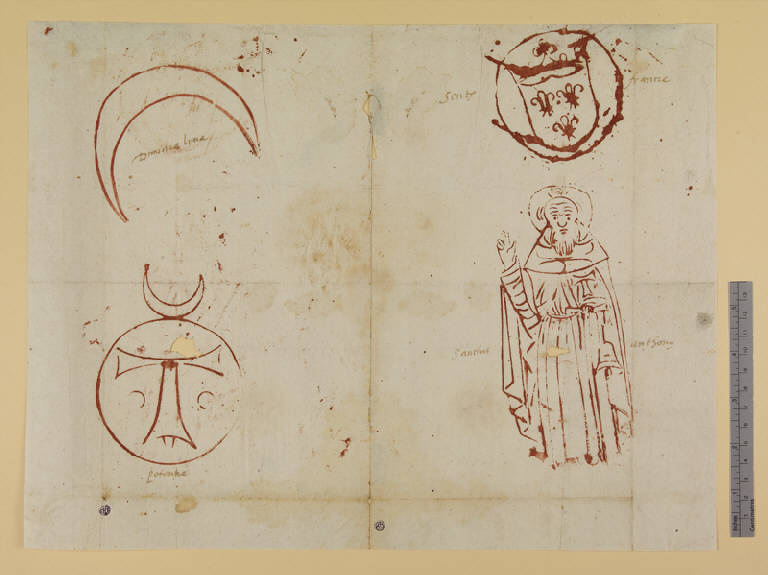 Foglio con prove di stampa, Mezzaluna, stemma, santo, simbolo taumaturgico
