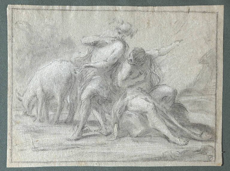 Riquadrato a matita. A matita nera grassa, acquerello grigio e gessetto bianco su carta grezza, scurita.. PERSONAGGI: Mercurio; Argo. ATTRIBUTI: (Mercurio) elmo alato. PAESAGGIO: bosco. ANIMALI: buoi