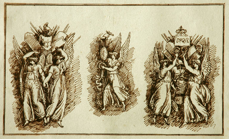 Riquadrato a penna. A penna e inchiostro nero su carta bianca, spessa. Studio per una "Allegoria della vittoria", in tre diverse versioni: a sinistra, schizzo di due figure femminili alate con panoplia di elmi, corazze e scudi; al centro, schizzo di una figura femminile alata con insegne militari; a destra, schizzo di due figure femminili alate con insegna "S.P.Q.R." e panoplia di armi.. ALLEGORIE-SIMBOLI: Vittoria. OGGETTI: elmi; corazze; scudi; insegne militari romane