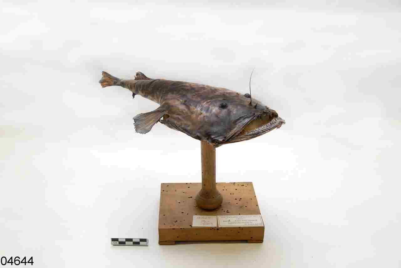 Chordata, Actinopterygii, Lophiiformes, Lophiidae, Lophius, L. piscatorius.Esemplare tassidermizzato di Lophius piscatorius sostenuto da una colonnina su una base di legno. La rana pescatrice presenta una testa massiccia ricoperta di creste ossee e spine, appiattita e allargata, di forma ovale, così come la parte anteriore del corpo, con numerosi denti acuti. La mascella inferiore è prominente rispetto a quella superiore. Nella mandibiola e lungo il corpo sono presenti delle appendici cutanee a forma di frange. La colorazione è bruno-olivastra o rossastra sul dorso e bianca sul ventre. Le pinne sono orlate di scuro. Il primo raggio della pinna dorsale è estremamente sviluppato e dotato di una piccola escrescenza carnosa.
