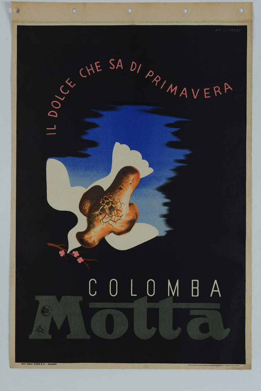 Lettura iconografica: colomba; ramoscello di pesco; colomba pasquale. Categoria merceologica/ tipo evento: industria alimentare; pasticceria; dolci; colomba pasquale. Nomi: Colomba Motta. Luoghi: Milano