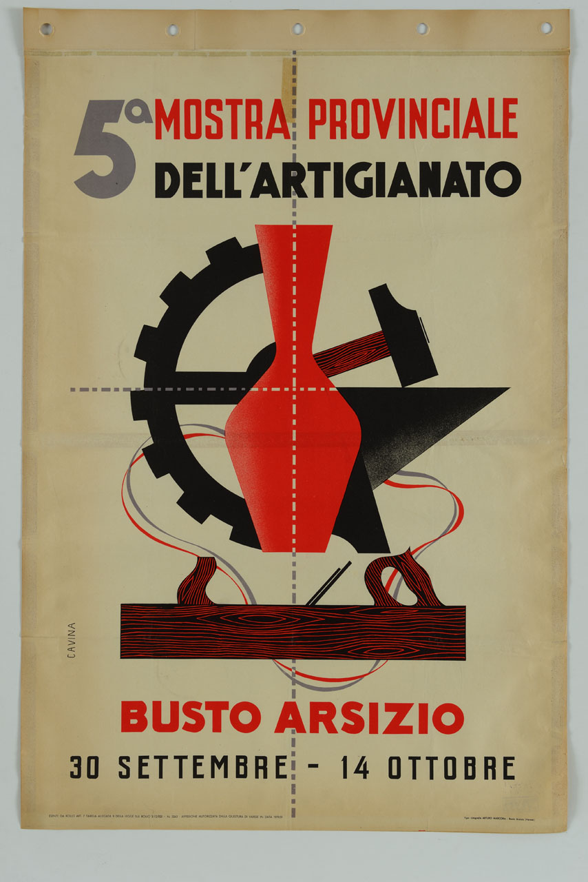 Lettura iconografica: ruota dentata; vaso; incudine; martello; pialla. Categoria merceologica/ tipo evento: artigianato; mostre mercato. Nomi: 5 Mostra provinciale dell'artigianato. Luoghi: Varese; Busto Arsizio