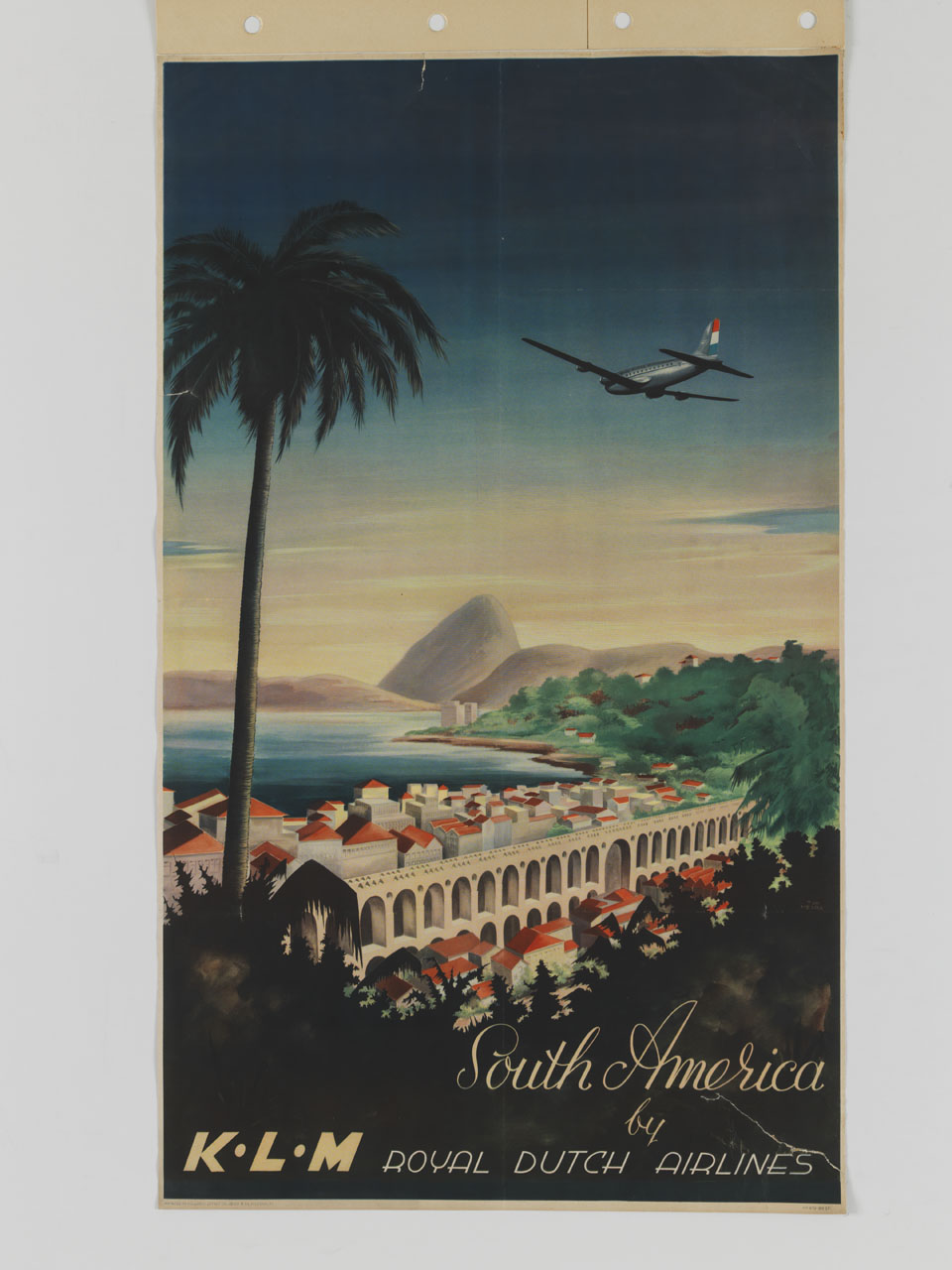 Lettura iconografica: veduta di città; acquedotto; aeroplano; palma; mare. Categoria merceologica/ tipo evento: turismo; trasporti; trasporto aereo; compagnia aerea; aeroplano. Nomi: South America; KLM; Koninklijke Luchtvaart Maatschappij; Royal Dutch Airlines; Archi di Lapa. Luoghi: Brasile; Rio de Janeiro; Olanda; Amsterdamm