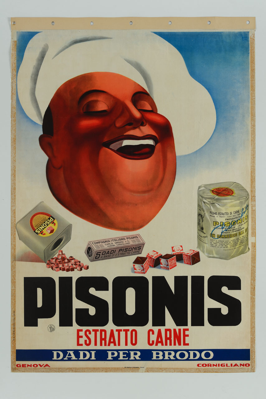 Lettura iconografica: figura maschile; volti; cuoco; abbigliamento da lavoro; copricapo; toque blanche; confezioni di carta; contenitori in latta; contenitori in cartone; sacchetto di polvere di brodo; lattina di dadi da brodo; bue. Categoria merceologica/ tipo evento: industria alimentare; preparati per brodi; dado da brodo; estratto di carne; estratto vegetale; industria chimica. Nomi: Pisonis; Compagnia Italiana Pisonis Carlo Grossi C.; azoto; creatinina; anidride fosforica; cloruro sodico. Luoghi: Italia; Genova; Cornigliano