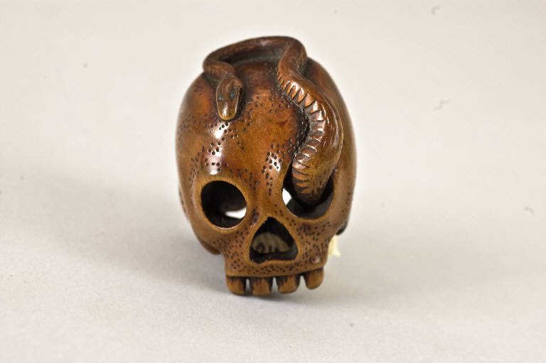 Netsuke raffigurante un cranio realisticamente cavo, tra le aperture del quale si insinuano le spire di un serpente la cui testa fuoriesce attraverso un globo oculare.. ALLEGORIE-SIMBOLI: serpente. ALLEGORIE-SIMBOLI: teschio