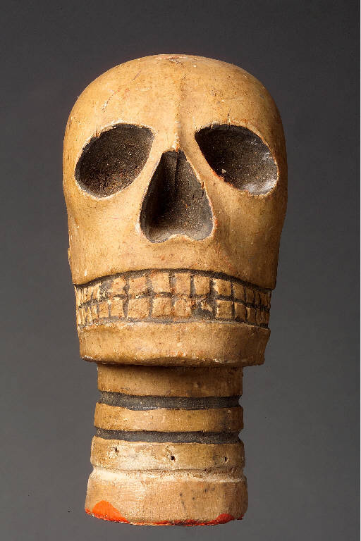 Testa tornita color legno a forma di teschio. La fila di denti scolpiti è molto evidente, l'intarsio viene ripreso con due righe parallele sul collo che termina con colore rosso. La cavità nasale e le oculari sono colorate di marrone scuro. Integro funzionante.