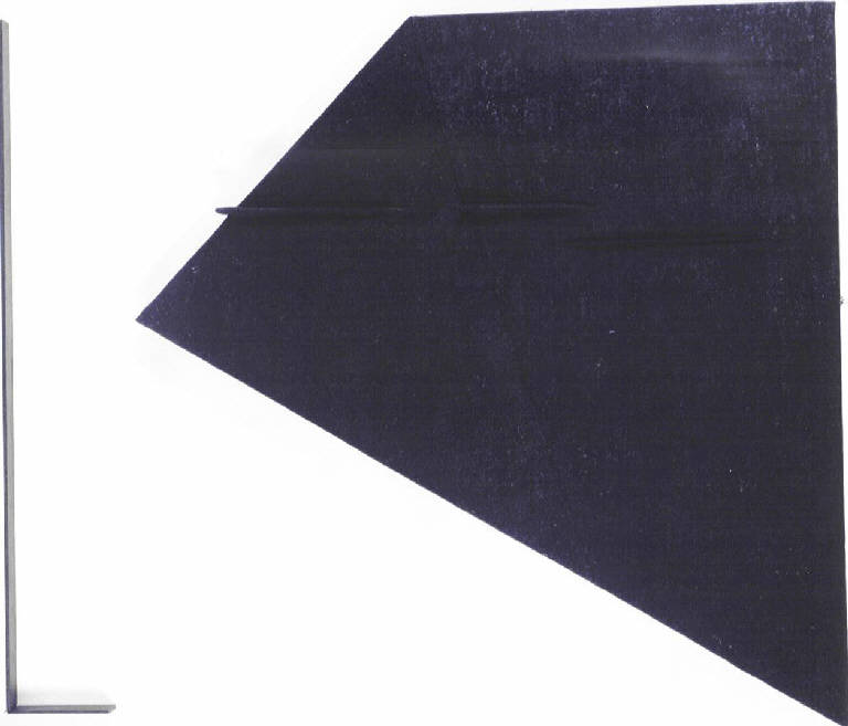 Opera costituita da due elementi: una forma sagomata grigia e una barra in ferro da applicare sotto a una distanza di 10 cm.. COSTRUZIONE: forma astratta e barra sagomata