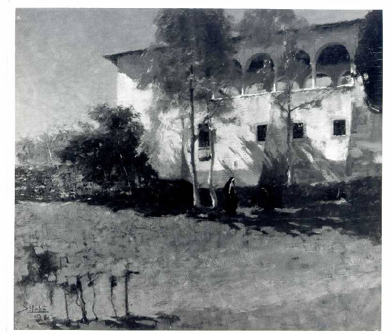 Opera pittorica che rappresenta un convento inserito in un paesaggio verdeggiante. La stesura è veloce e franta. La luce laterale illumina il convento e proietta le ombre degli alberi.. PAESAGGIO: prato; alberi; cielo; convento