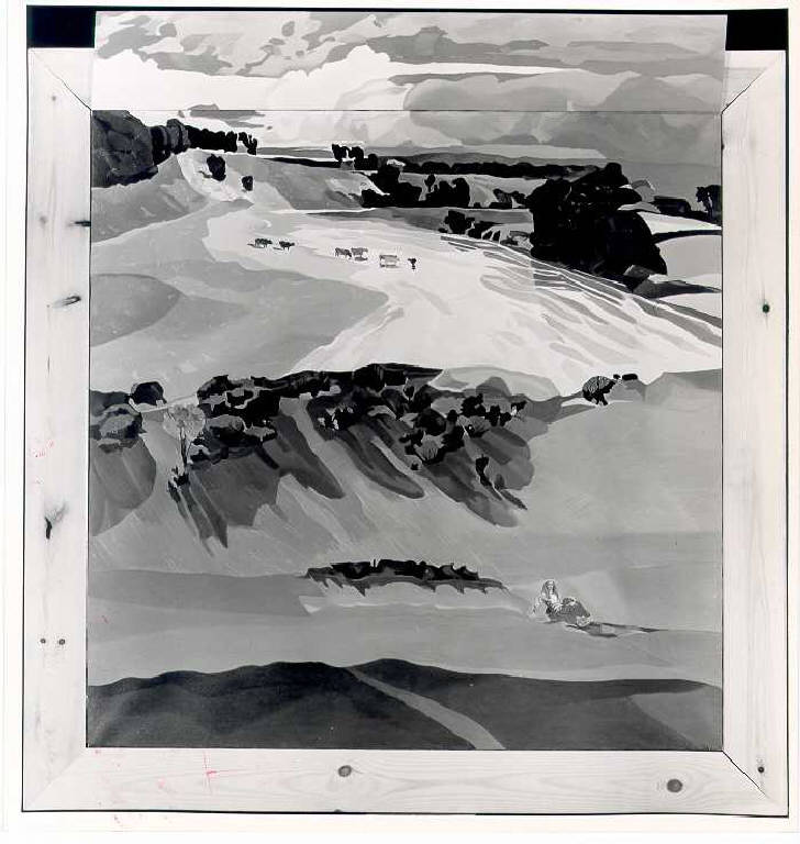 Opera pittorica che rappresenta un paesaggio di montagna visto dall'alto e secondo diverse prospetive. In primo piano colline verdi con figura femminile seduta a destra. In secondo piano un ampio pascolo. In fondo il paesaggio si perde nel cielo nuvoloso che esce al di là della cornice.||Il colore è caldo e sfumato. La luce è contrastata.. PAESAGGIO: Suffolk: colline, montagne, pascoli, alberi, cielo