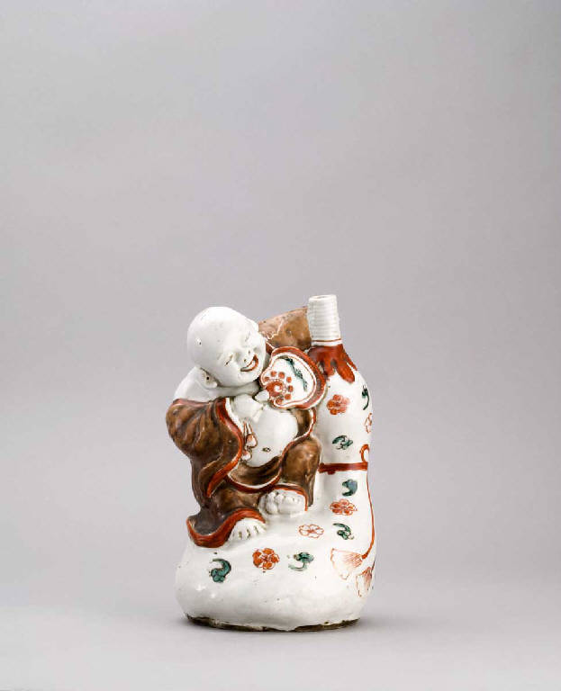 Vasetto in porcellana a forma di fiaschetta 'a zucca', sulla quale si aggrappa Hotei con ventaglio. La decorazione è dipinta a smalti rosso, verde e nero, applicati al di sopra dell'invetriatura trasparente.. Divinità orientali: Hotei