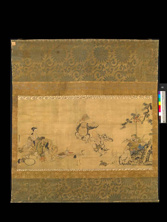 Il dipinto, nel formato del rotolo verticale da appendere (kakemono), è stato realizzato a inchiostro e colori su seta. Raffigura un scena con i Sette Dei della Fortuna, due dei quali (Hotei e Fukurokuju) ballano al centro della composizione, mentre gli altri assistono divertiti alla scena. Ha cornice tradizionale in seta decorata con motivo di tralci di crisantemi.. Divinità orientali: Sette Dei della Fortuna. Animali: gru. Animali: tartaruga. Animali: topo. Strumenti musicali: liuto. Strumenti musicali: percussione. Piante: pino. Fenomeni geologici: rocce. Oggetti: contenitori. Armi: alabarda