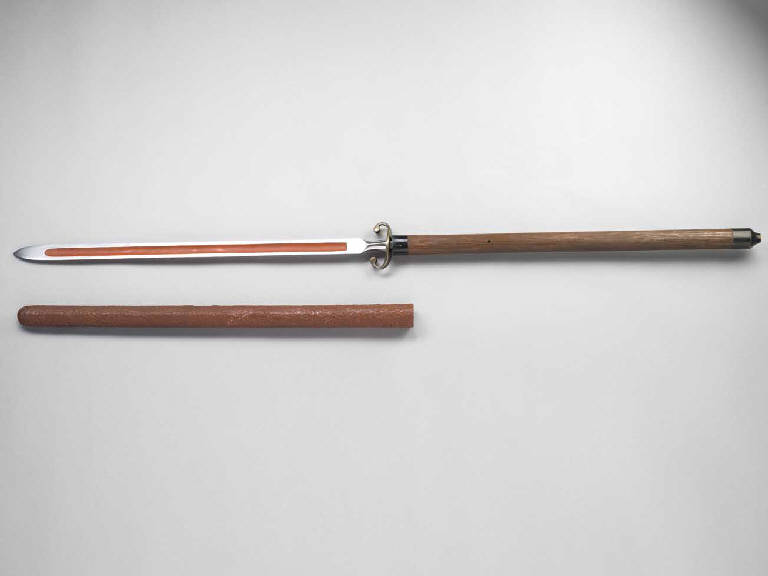 Lama (yari) piatta (hirasankaku), dotata di sguscio dritto semplice (bohi) dipinto di rosso, terminante con paramano (hadome) ricurvo ai due estremi.