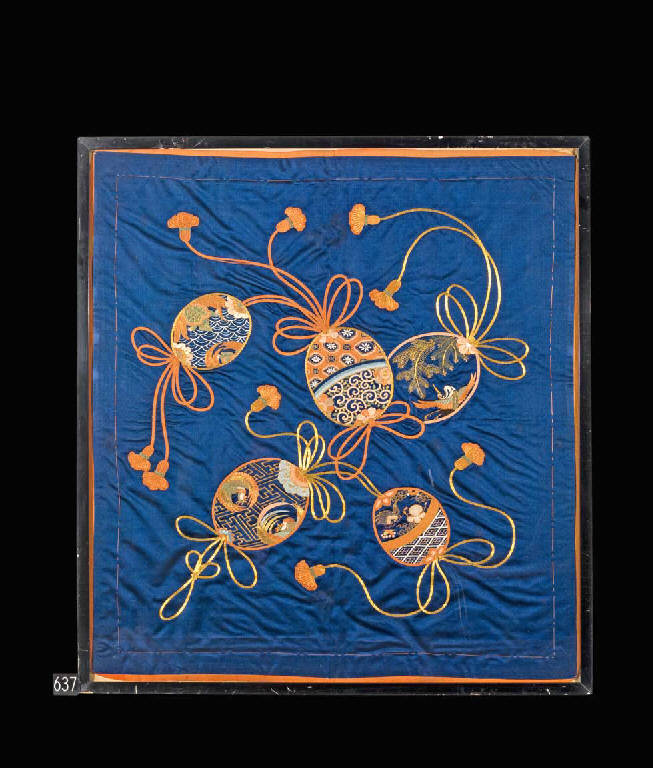 Tessuto in seta blu con decorazioni a ricamo policromo e oro raffigurante cinque ovuli attraversati da cordoni svolazzanti terminanti a foggia di fiore. All'interno degli ovuli sono ricamati motivi geometrici e zoomorfi (fenici, gru, granchi e tartarughe) di richiamo augurale. E' montato in cornice in legno.. Elementi decorativi: ovuli. Elementi decorativi: nastri. Elementi decorativi: motivi geomentrici. Animali: fenice. Animali: gru. Animali: granchio. Animali: tartaruga. Piante: pino