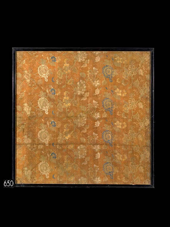 Tessuto decorazione azzurra e oro di tralci fioriti stilizzati su fondo bruno.. Fiori